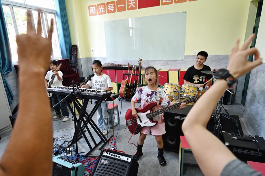 El Proyecto Galaxia Luciérnaga, una banda inclusiva para personas con discapacidad compuesta por cuatro niños del Centro de Educación Especial Yunyang, en el distrito Yunyang de Chongqing, suroeste de China, ensaya bajo la guía de sus profesores el 3 de septiembre. [Foto de Li Ye/Para chinadaily.com.cn]