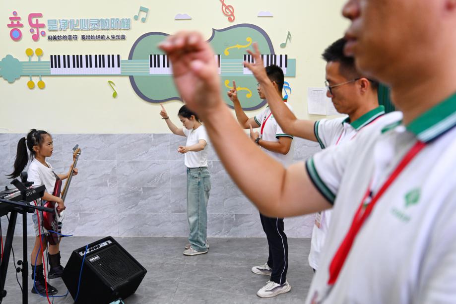 El Proyecto Galaxia Luciérnaga, una banda inclusiva de cuatro niños con discapacidad del Centro de Educación Especial Yunyang en el distrito Yunyang de Chongqing, suroeste de China, ensaya bajo la guía de sus maestros el 3 de septiembre. [Foto de Li Ye/Para chinadaily.com.cn]