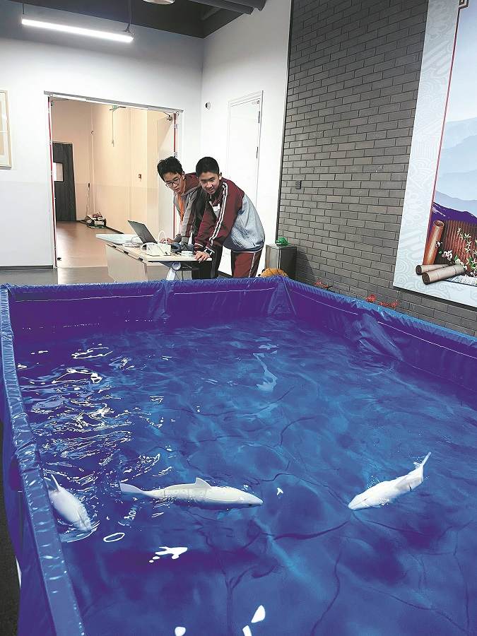 Estudiantes de la Academia de Beijing examinan peces robot durante un seminario internacional organizado por la academia en Beijing el 13 de diciembre. [Foto proporcionada a China Daily]