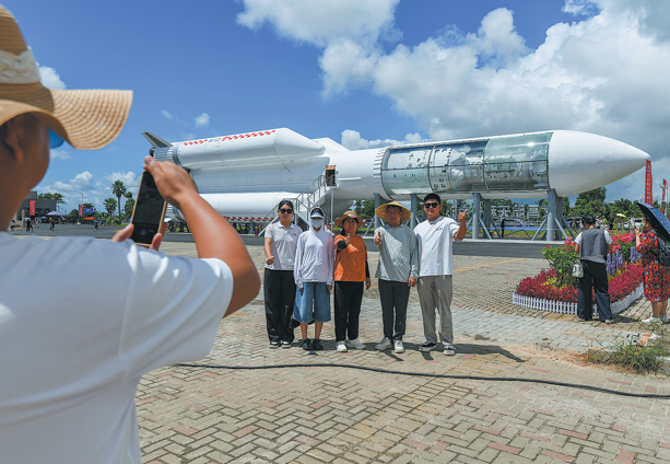 Turistas que buscan una experiencia interactiva e inmersiva posan para una foto durante una prueba de estrés de cohetes en el Centro de Ciencia del Vuelo Espacial de Wenchang, 3 de octubre del 2026. (Foto: Luo Yunfei/ Servicios de Noticias de China)