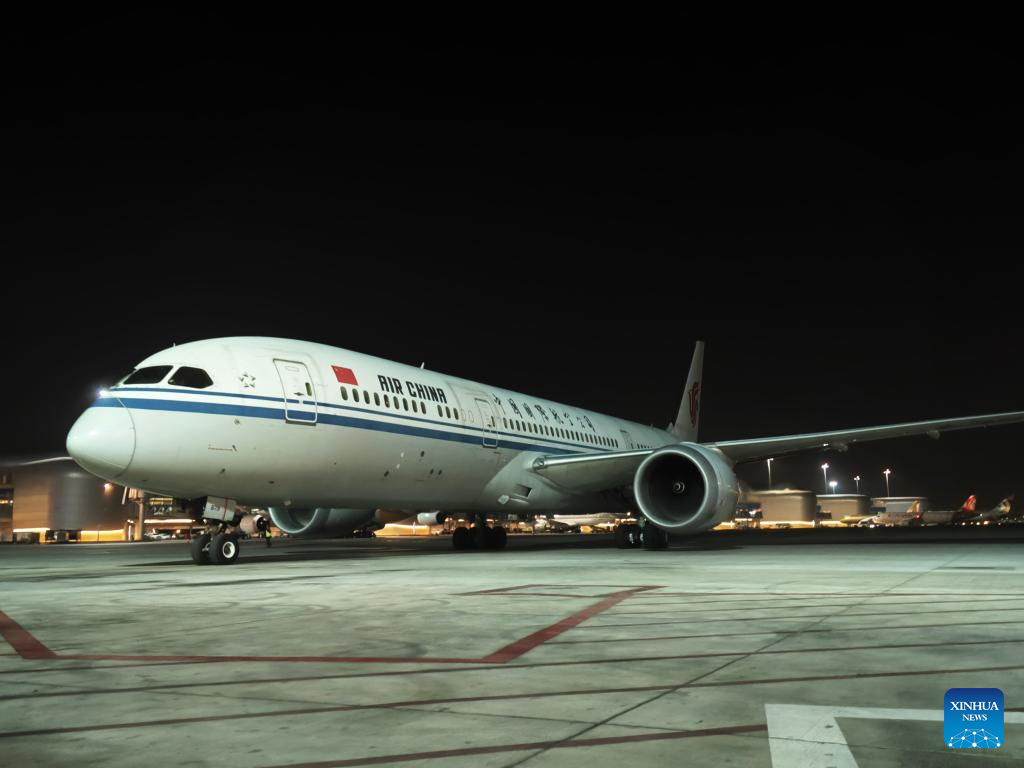 ABU DABI, 25 enero, 2026 (Xinhua) -- Imagen del 24 de enero de 2026 del vuelo inaugural operado por Air China, entre Beijing y Abu Dabi aterrizando en el Aeropuerto Internacional de Zayed, en Abu Dabi, Emiratos Arabes Unidos (EAU). Una ruta aérea directa entre la capital de China, Beijing y Abu Dabi, en los EAU, ha sido lanzada, marcando la primera conexión directa entre ambas capitales operada por una aerolínea china. (Xinhua)