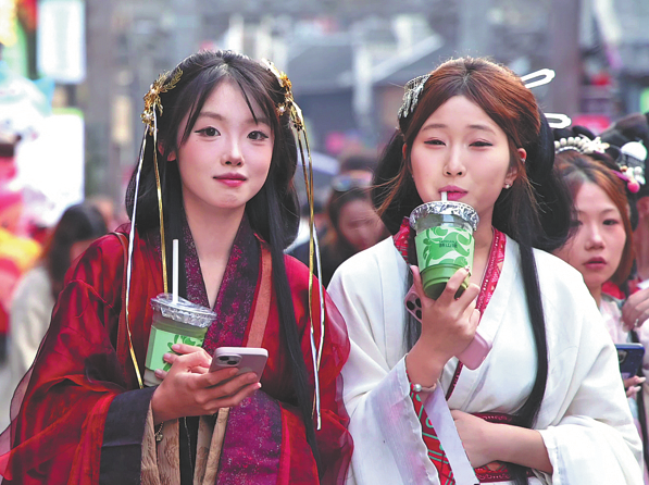 El 23 de febrero, los visitantes disfrutan del matcha mientras recorren la antigua ciudad de Zhongnanmen en Tongren, Guizhou. ZHU ZILI/CHINA DAILY