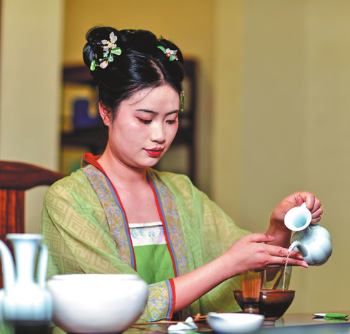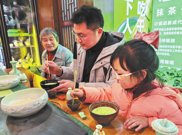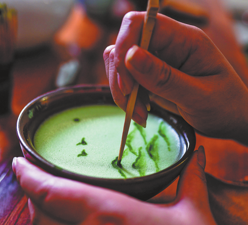 El 18 de febrero, visitantes participaron en la elaboración de té matcha en la antigua ciudad de Zhongnanmen. LIU YU/CHINA DAILY