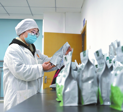 Una trabajadora revisa el empaquetado de productos matcha en un centro de control de calidad de Guizhou Gui Tea Group Co. en Jiangkou, el 28 de febrero. XIE JIAJIE/CHINA DAILY