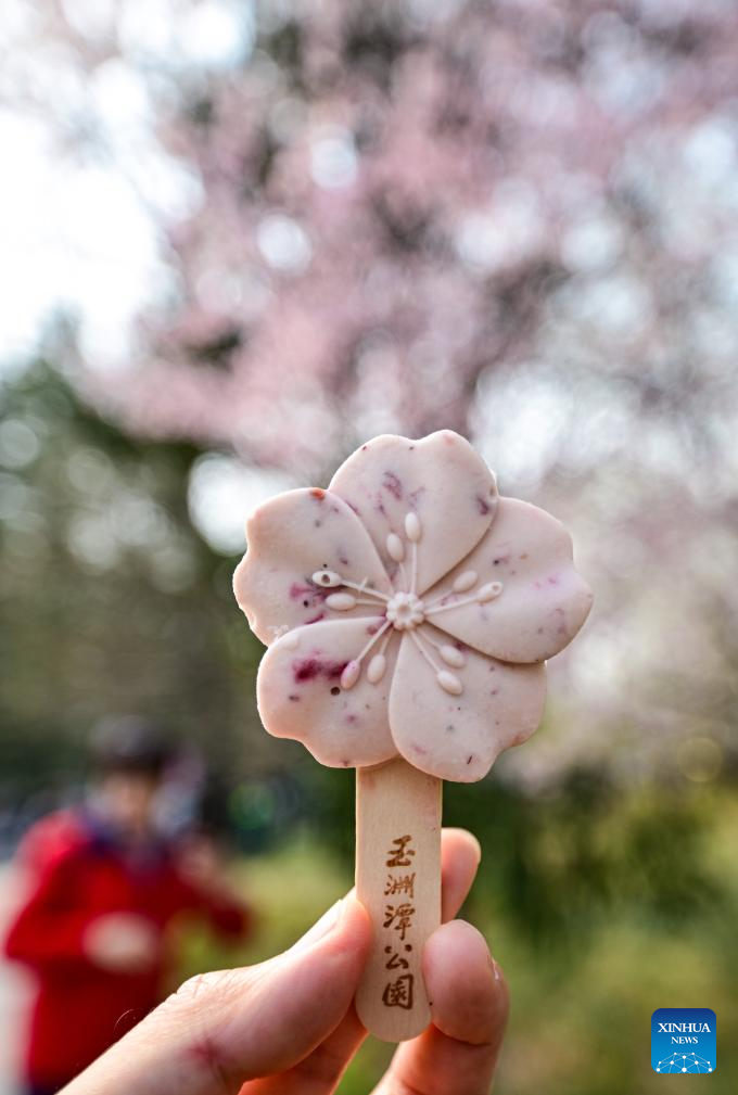 Imagen del 23 de marzo de 2026 de una paleta con forma de flor de cerezo vista en el parque Yuyuantan, en Beijing, capital de China. Con el aumento de las temperaturas, numerosos parques y puntos escénicos de Beijing han organizado ferias con temática primaveral y han lanzado productos culturales y creativos, lo que supone un buen impulso para la economía de primavera. (Xinhua/Chen Yehua)