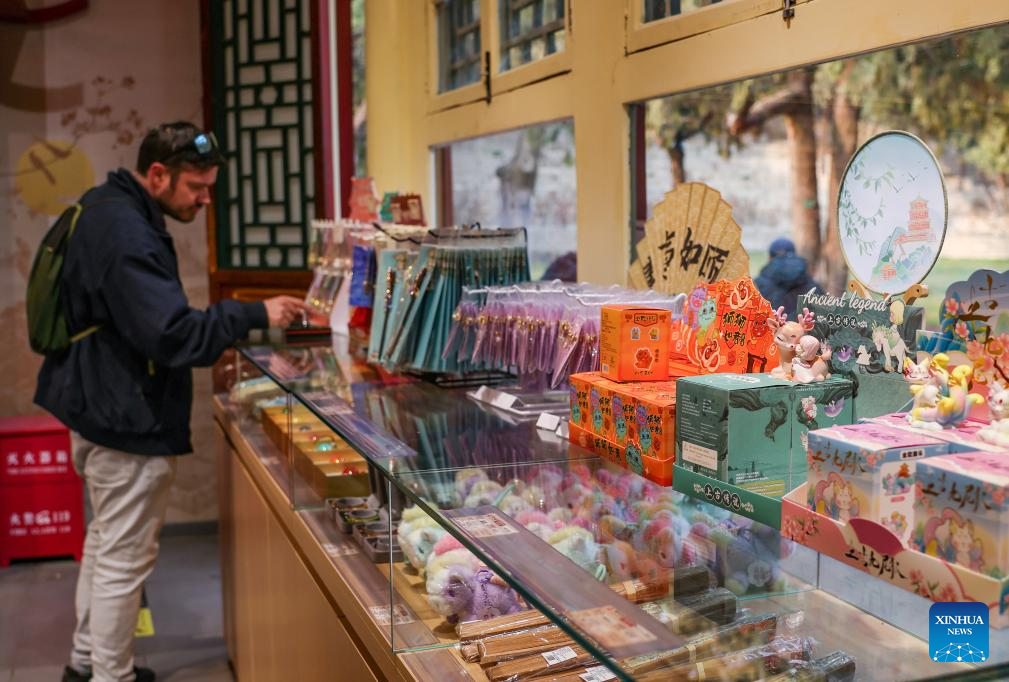 Imagen del 23 de marzo de 2026 de productos culturales y creativos vistos en una tienda en el Palacio de Verano, en Beijing, capital de China. Con el aumento de las temperaturas, numerosos parques y puntos escénicos de Beijing han organizado ferias con temática primaveral y han lanzado productos culturales y creativos, lo que supone un buen impulso para la economía de primavera. (Xinhua/Zhang Fan)
