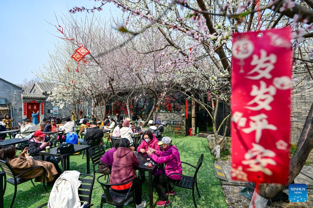 Imagen del 23 de marzo de 2026 de personas disfrutando de su tiempo libre en una cafetería en el parque Sanlihe, en Beijing, capital de China. Con el aumento de las temperaturas, numerosos parques y puntos escénicos de Beijing han organizado ferias con temática primaveral y han lanzado productos culturales y creativos, lo que supone un buen impulso para la economía de primavera. (Xinhua/Chen Yehua)
