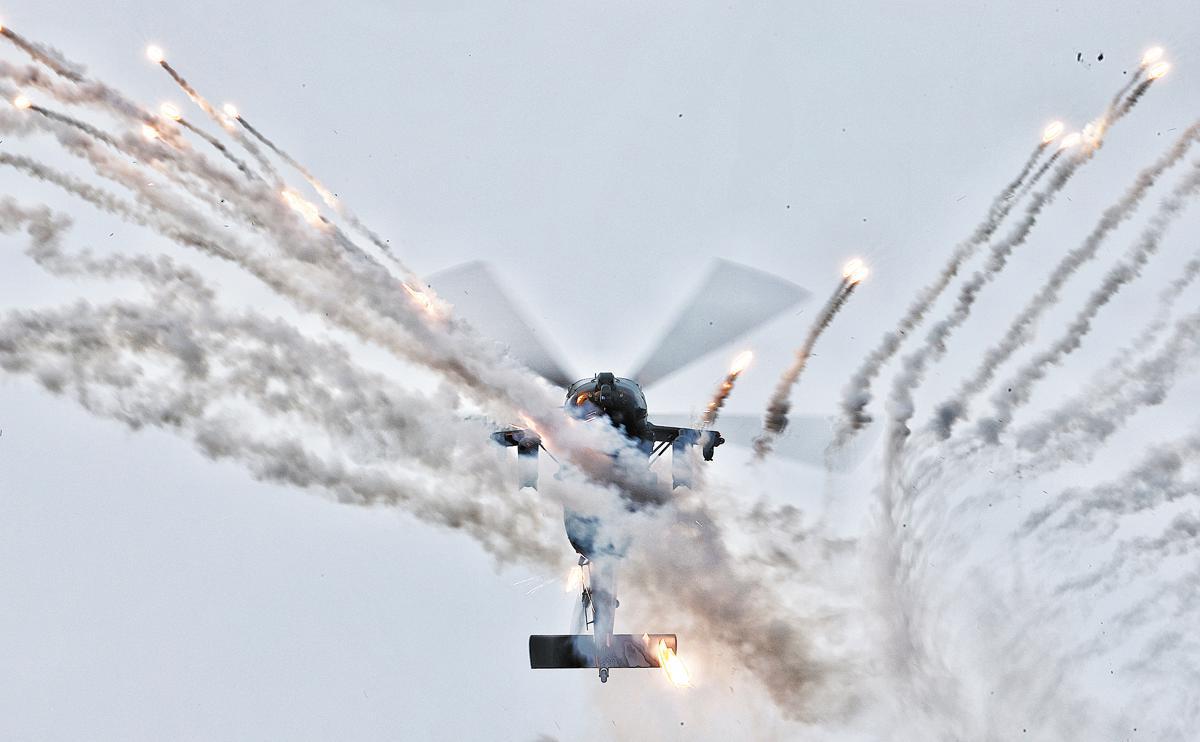 Helicóptero Z-20T lanza bengalas durante su demostración de vuelo en la 7ª Exposición de Helicópteros de China en Tianjin el jueves. (Foto: Tao/ China Daily)