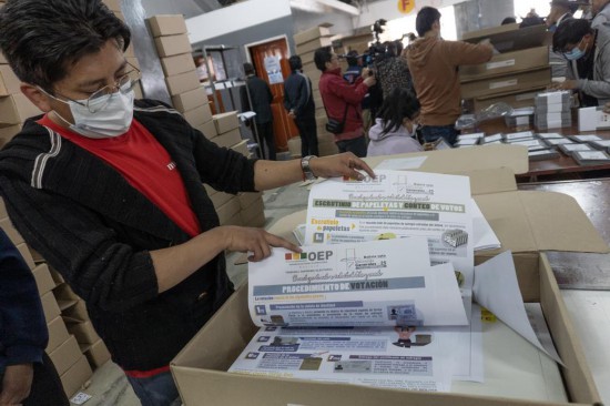 Imagen del 7 de octubre de 2025 de un funcionario mostrando la guía de procedimiento electoral durante el armado de las maletas electorales para su traslado en la bodega del Tribunal Electoral Departamental, en La Paz, Bolivia. (Xinhua/Javier Mamani)