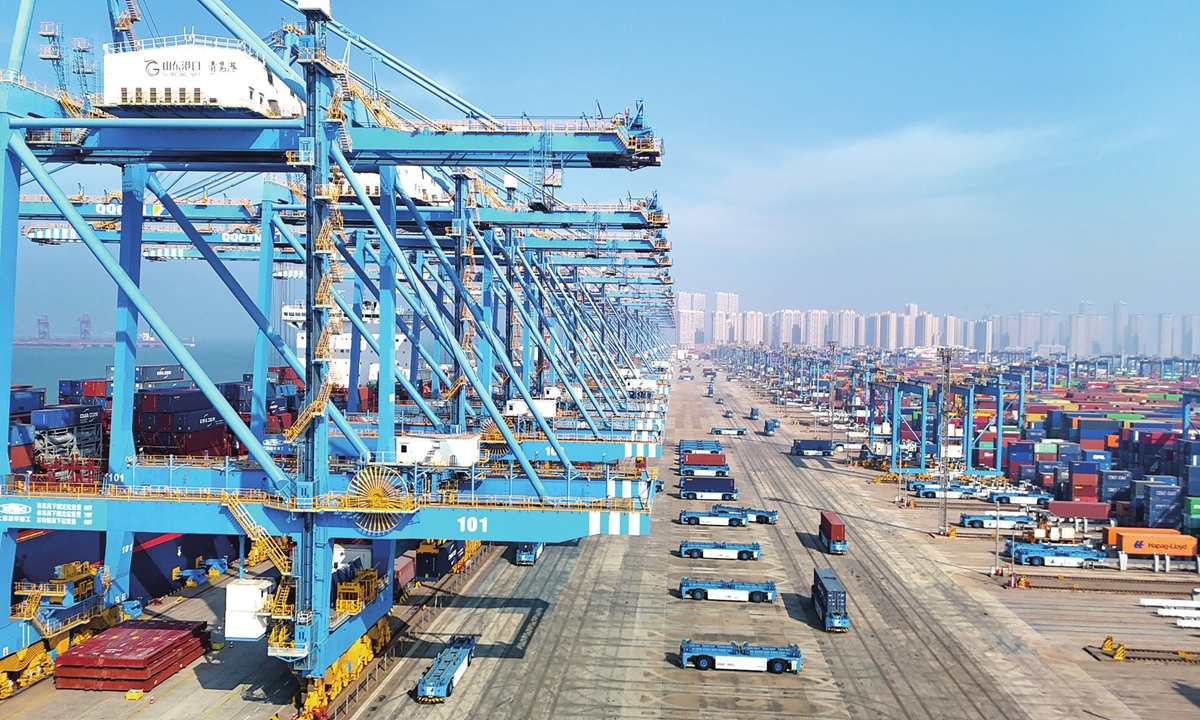 Vehículos de guiado automático manipulan carga en la terminal totalmente automatizada del Puerto de Qingdao, perteneciente al Grupo Portuario de Shandong, el 4 de febrero de 2026. Foto: VCG