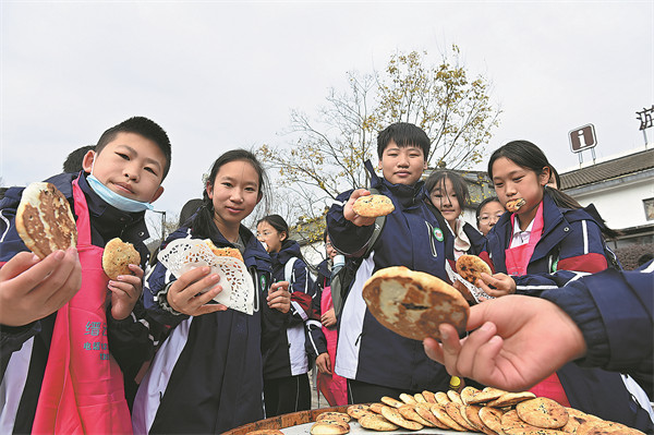 Estudiantes en un viaje de estudios aprenden a hacer shaobing de Jinyun en la zona escénica de Xiandu en la provincia de Zhejiang el 5 de diciembre de 2025, experimentando la artesanía tradicional detrás del aperitivo. Bao Kangxuan/Para China Daily